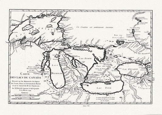 Bellin, Carte des lacs du Canada, Dressée sur les manuscrits du depost des cartes,1744, map on heavy cotton canvas, 50x70cm approx.